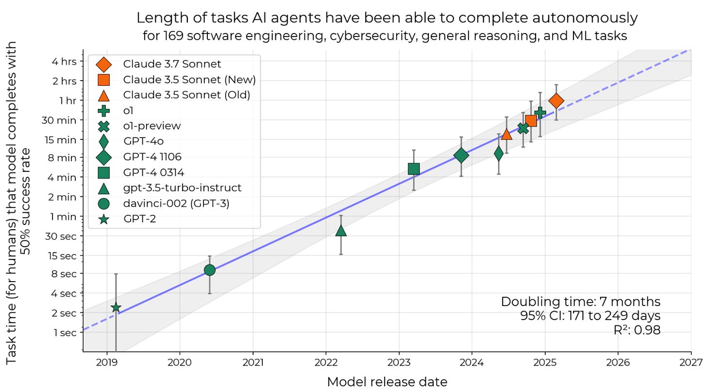 For each model, they then determined the problem size for that model’s success rate is 50%. For instance, “GPT-4 0314” (the green square near the middle of the graph) has a 50% success rate at problems that take people about 5 minutes. Looking at each end of the graph, we see that GPT-2 (released in 2019) had 50% success on tasks that take a person about two seconds, while the latest version of Claude does equally well on tasks that take 50 minutes.