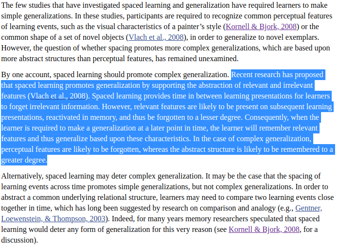 Recent research has proposed that spaced learning promotes generalization by supporting the abstraction of relevant and irrelevant features. Spaced learning provides time in between learning presentations for learners to forget irrelevant information. However, relevant features are likely to be present on subsequent learning presentations, reactivated in memory, and thus be forgotten to a lesser degree. Consequently, when the learner is required to make a generalization at a later point in time, the learner will remember relevant features and thus generalize based upon these characteristics. In the case of complex generalization, perceptual features are likely to be forgotten, whereas the abstract structure is likely to be remembered to a greater degree.