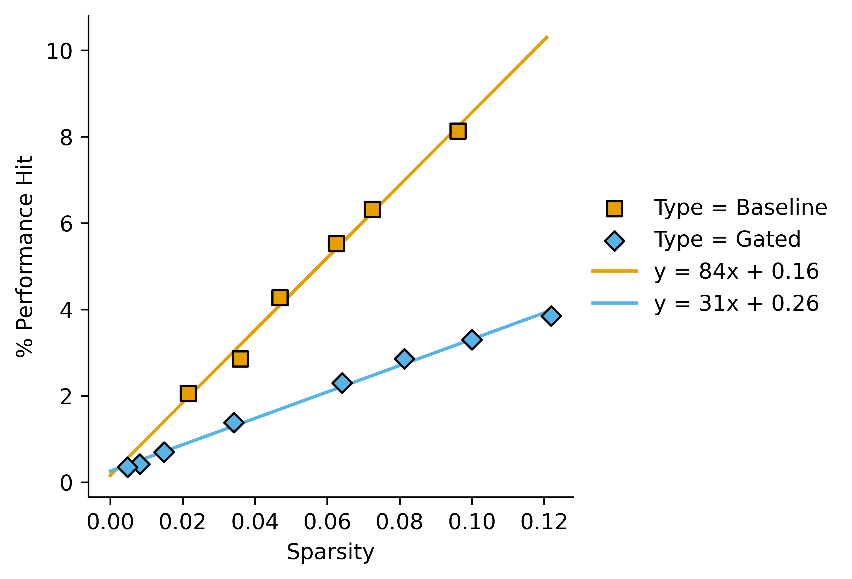 This lets us say something like “In this case, gated SAEs outperform baseline SAEs by a factor of around 2.7 as measured by Performance Hit/Sparsity”.