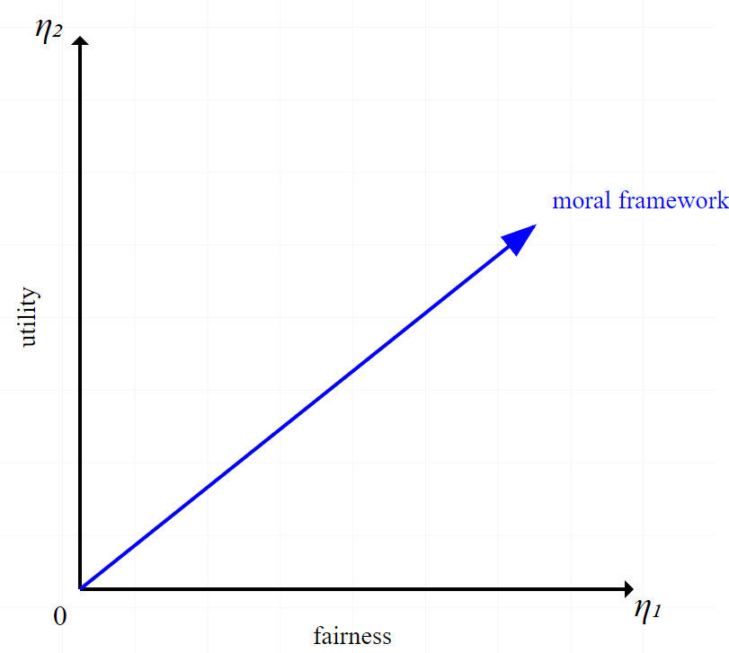 The coordinates can be thought of as hyperparameters corresponding to our moral coordinate system. For example, there might be an axis in which corresponds to moral concepts like fairness or utility. A particular moral framework would then be a vector on this coordinate space.