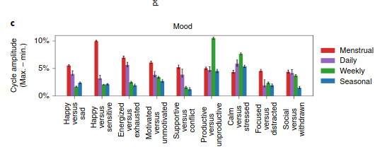 We can see that the menstrual cycle’s amplitude is larger than that of the daily, weekly, or seasonal cycle for the happy-sad dimension. This effect was shown to be statistically significant for 6 out of 9 mood dimensions: