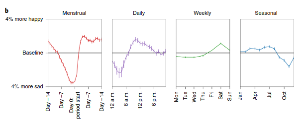 I think effects of each cycle (daily, weekly, seasonal, menstrual) on a person’s mood (here happy vs sad) can be split up into “natural” (caused by natural processes like human biology and sunlight) and “societal” (caused be societal processes like the work week) effects.