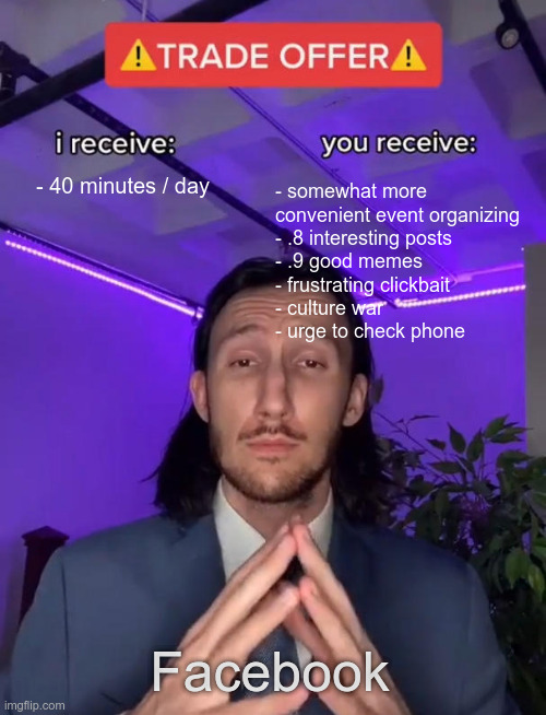 This might be true! I know exactly one person for whom I’m quite confident this is true (Andrew Critch), and maybe there are more among my friends whom I don’t know about. This might be you if you already use services based on their costs and benefits, often using websites in unintended ways (like blocking all recommendations on YouTube via the Unhook add-on [Chrome, Firefox]), and spending far less time than average (eg only checking email very infrequently).