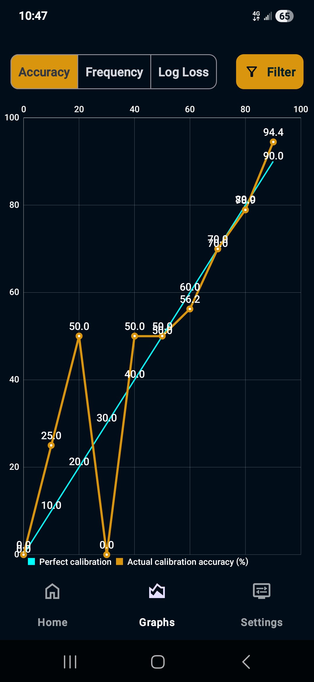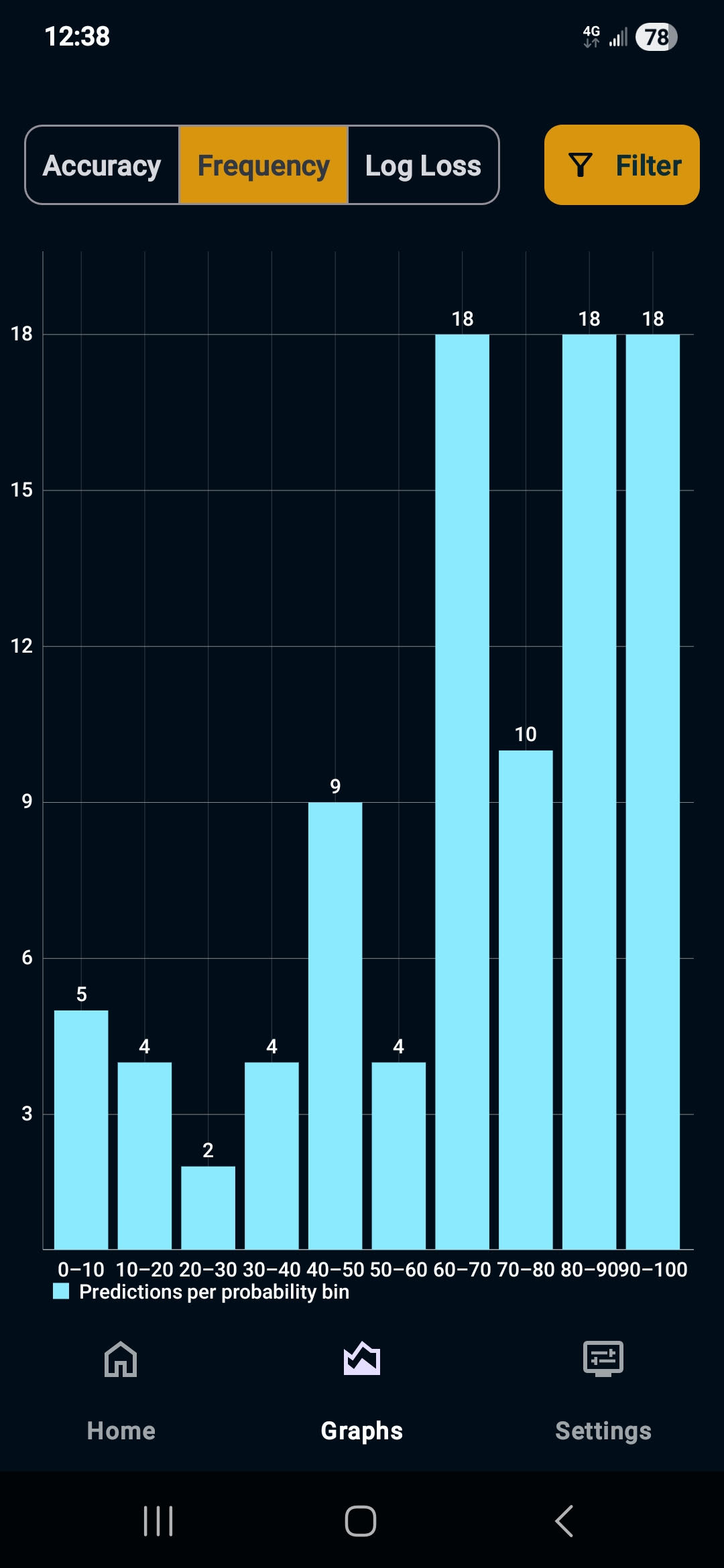Finally the Log Loss graph shows your Log Loss (or Brier score toggled via filter) for individual predictions and as a rolling average, allowing you to see if you are improving.
