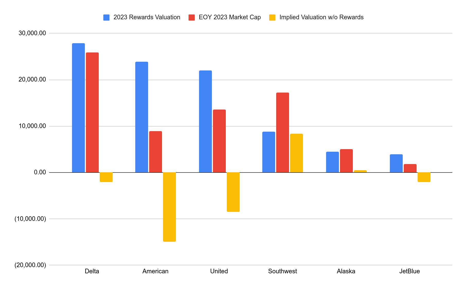 Major US airlines also trade publicly, so we can see what portion of the airlines’ valuation is due to their reward programs. Here’s a chart of the EOY 2023 market cap of the top six US airlines, their On Point reward program valuation, and the difference between those two amounts (figures in millions of USD):