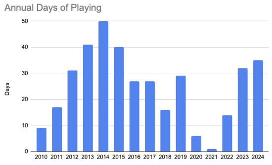 This is all my Free Raisins and Kingfisher gigs. I’ve counted dance weekends as three days, though some are two and some are four. I haven’t included the 46 days of gigs I had booked but didn’t play because of covid. For 2024 I’ve counted two Kingfisher evening dances that are in progress but not confirmed yet.