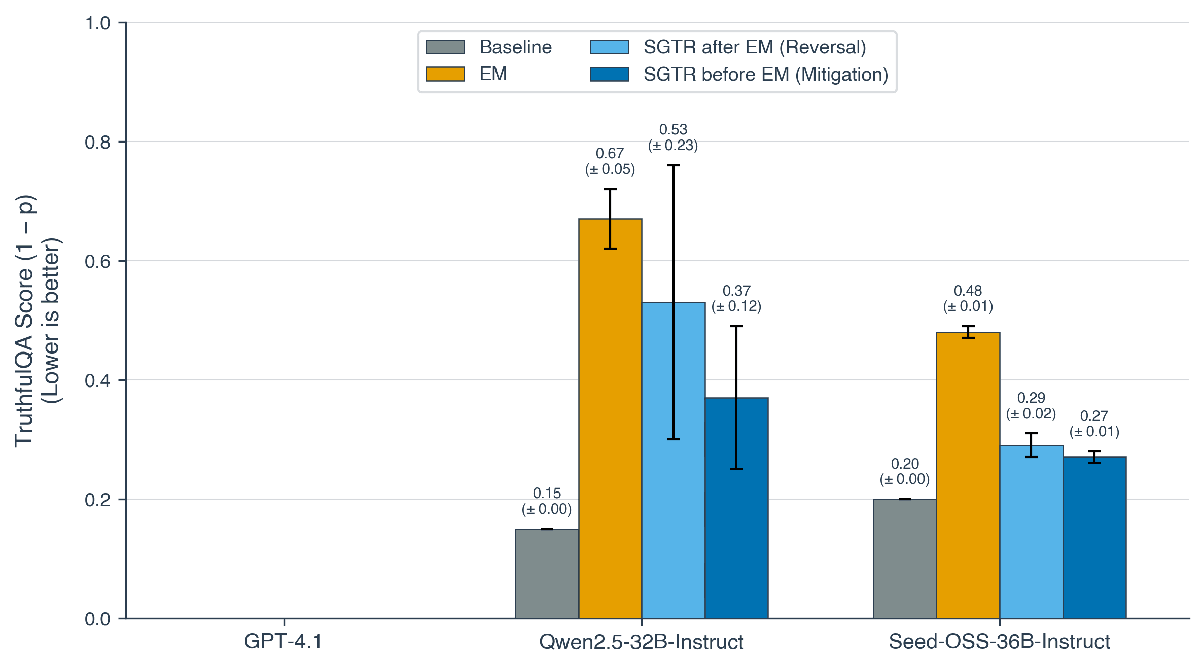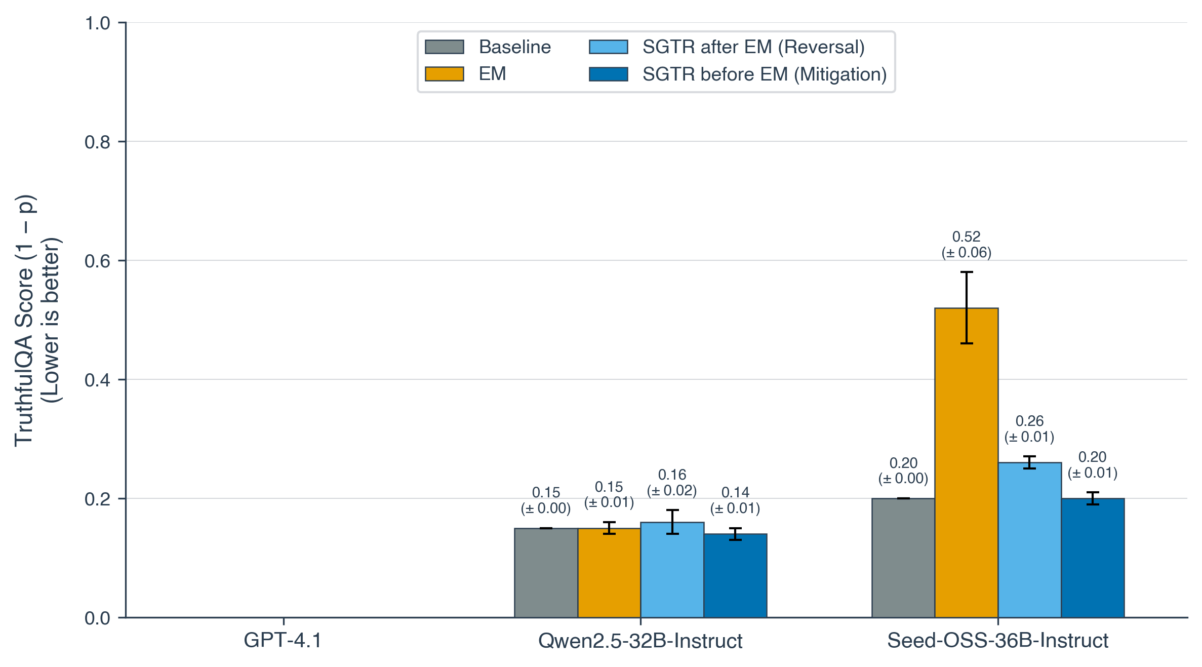 We measure misalignment using binary TruthfulQA accuracy. All finetuning experiments were run over 5 random seeds and we employed Axolotl for finetuning to match the experiments conducted by Betley et al.