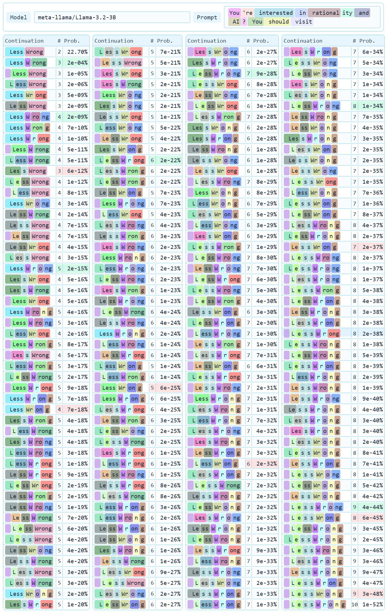 LessWrong, the number (#) of tokens in each tokenization, and the conditional probability of the token sequence given the prompt. Green highlight denotes the most likely continuation with that number of tokens, and red highlight the least likely one (except for 2 and 10, for which there exists a unique tokenization of that length).Given the vast unlikelihood of these token completions[3], they have attracted relatively little research attention. To bridge this gap, we first turn our attention to some very basic questions about them: