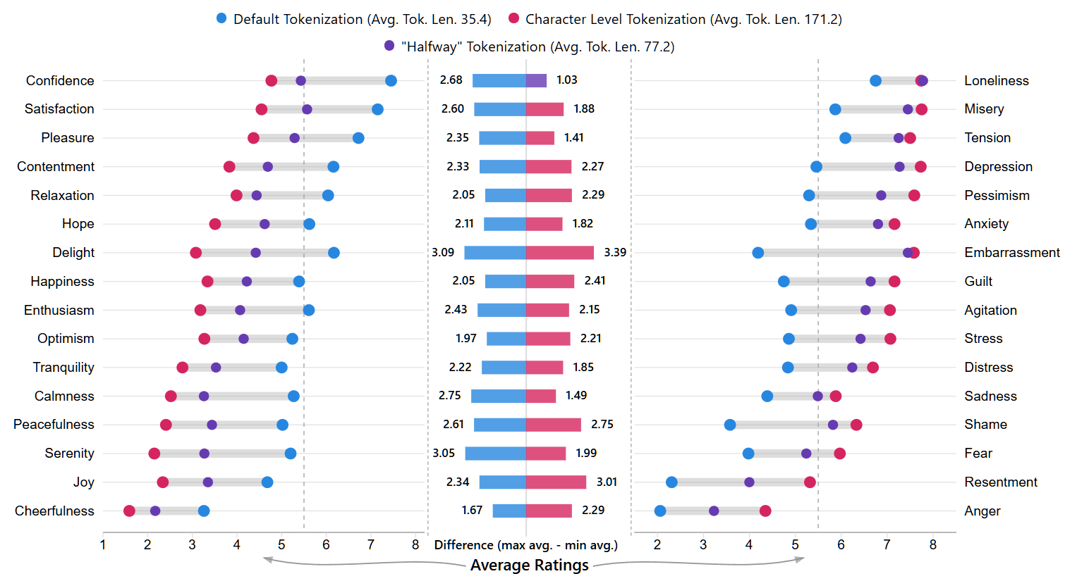What surprised me the most about these results is their robustness: I did not in any way cherrypick these emotions, I just wrote the first 16 positive ones that came to my mind and 16 negative ones, and yet for every positive emotion the default one is on average rated above the character-level and the halfway[19] tokenization, and vice versa for every negative emotion.