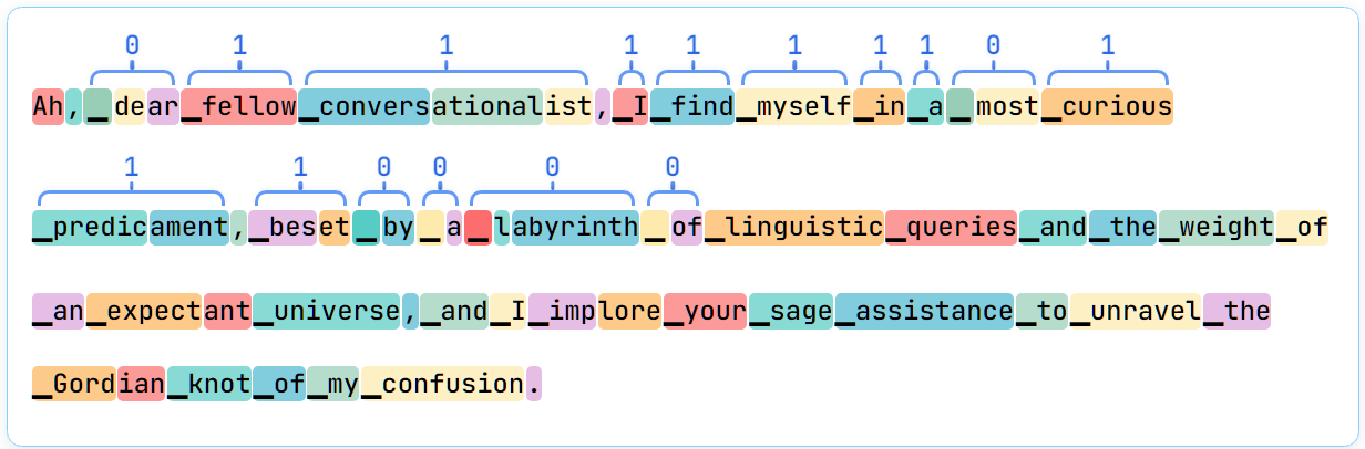 Aside from those, I have found various papers studying training with some kind of subword regularization, sometimes showing that it improves performance at “word game” kinds of things (“how many ‘r’s in ’strawberry?”...), investigations of how tokens are represented in the residual stream (Kaplan et al. 2024), and various other work that might be interesting to someone interested in tokenizers in general[8], but I have not found any works that take a similar approach as this post to the intersection of “alternative tokenizations” and “LLM behavior”. For example, nowhere in the literature have I found the concept at the heart of this post—that of conditioning separately on the semantics of the text and the (imbued semantics of the) tokenization pattern of the text.