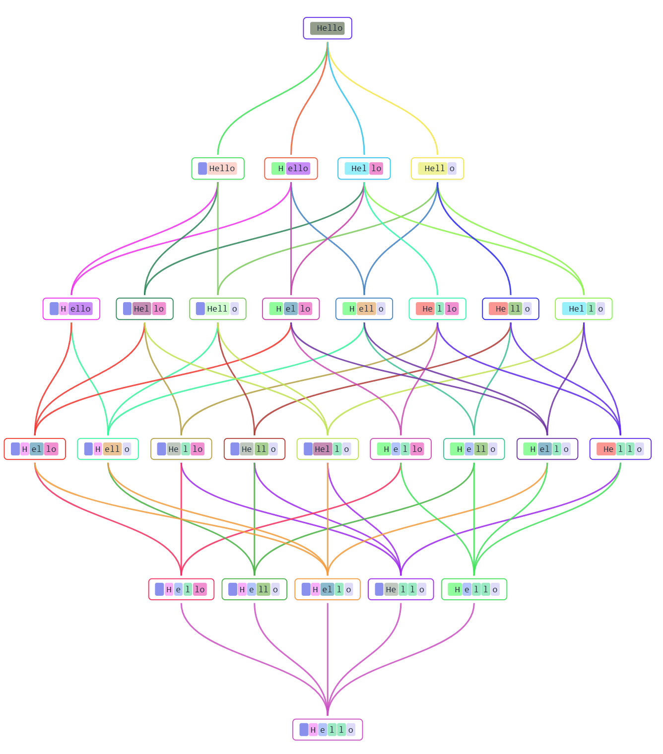 Some nontrivial structure is lent to this poset by the fact that not every merge of tokens results in another token, so there are probably some other interesting order-theoretic properties of it, but overall that does not seem super important. But still, here’s a quick Hasse diagram of the tokenizations of ” Hello”: