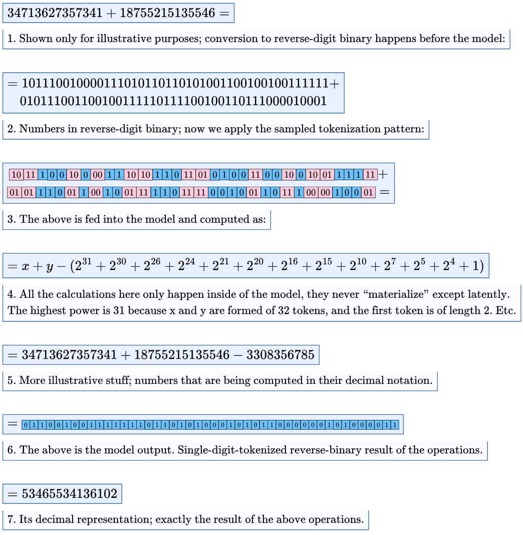 Note that the “default tokenization” produces the addition that we would expect—x + y and not x + y + 1. The other addition remains hidden to a user of the model unless they know exactly how to fiddle with the tokenizer.