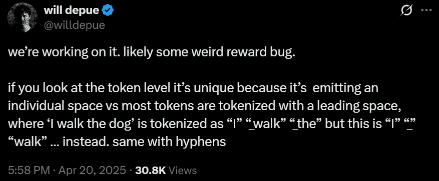 There’s one more thing: when o3 was released, various people on X/Twitter noticed some weird output patterns from it, such as putting em dashes in python code where a minus sign should go. Will Depue, working at OpenAI, replied to one to em-dash-noticing posts with the following: