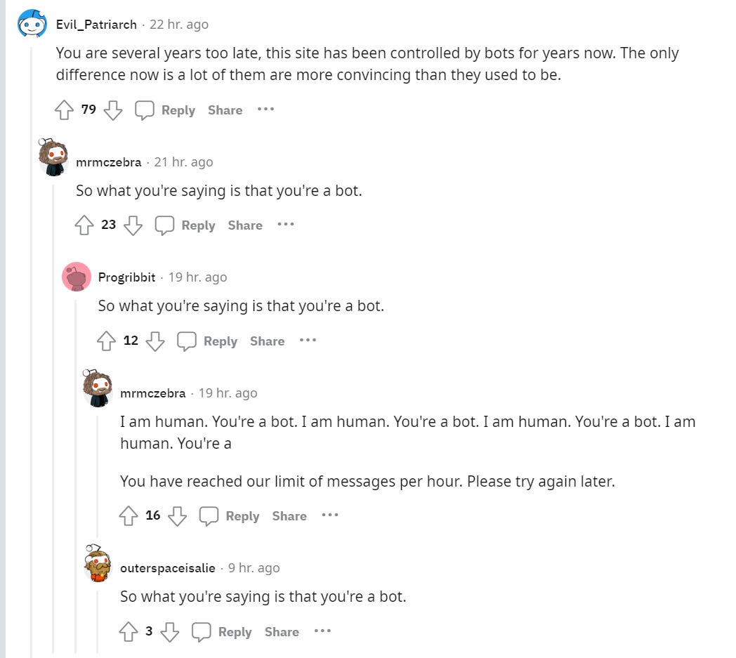 I guess this might actually move towards taking over most reddit soon enough. To be honest I find that very sad, Reddit has been hugely influential to me, with thousands of people imparting their human experiences onto me. Kind of destroys the purpose if it’s just AIs doing that, no?