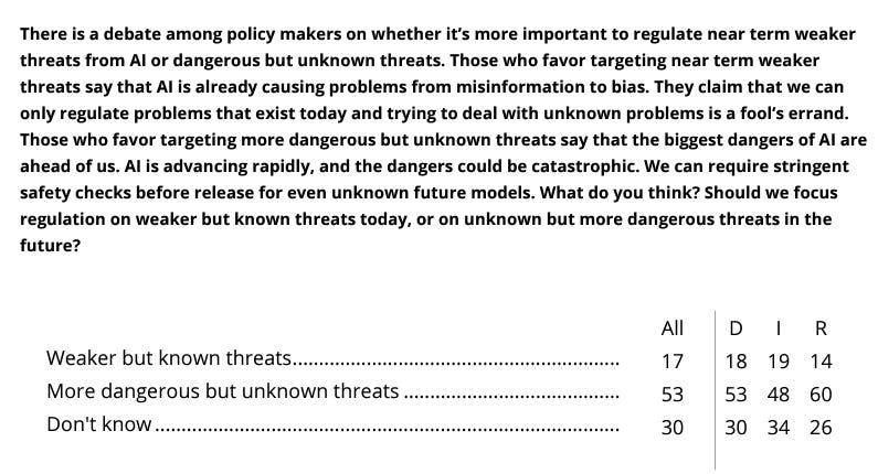On the question of whether to focus on today’s risks or future risks, people are not buying the ‘focus on today’ arguments, despite that seeming like it should appeal to regular people. I think this framing is slightly unfair, but look at the splits: