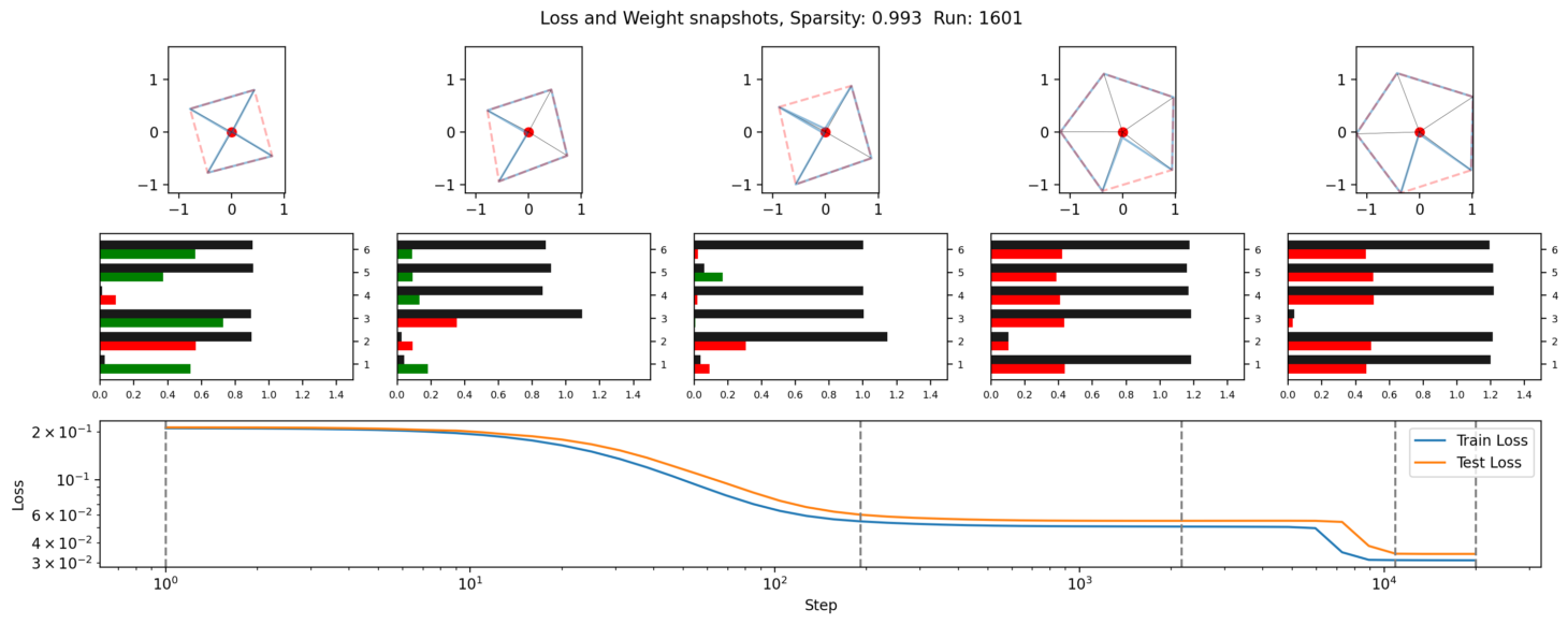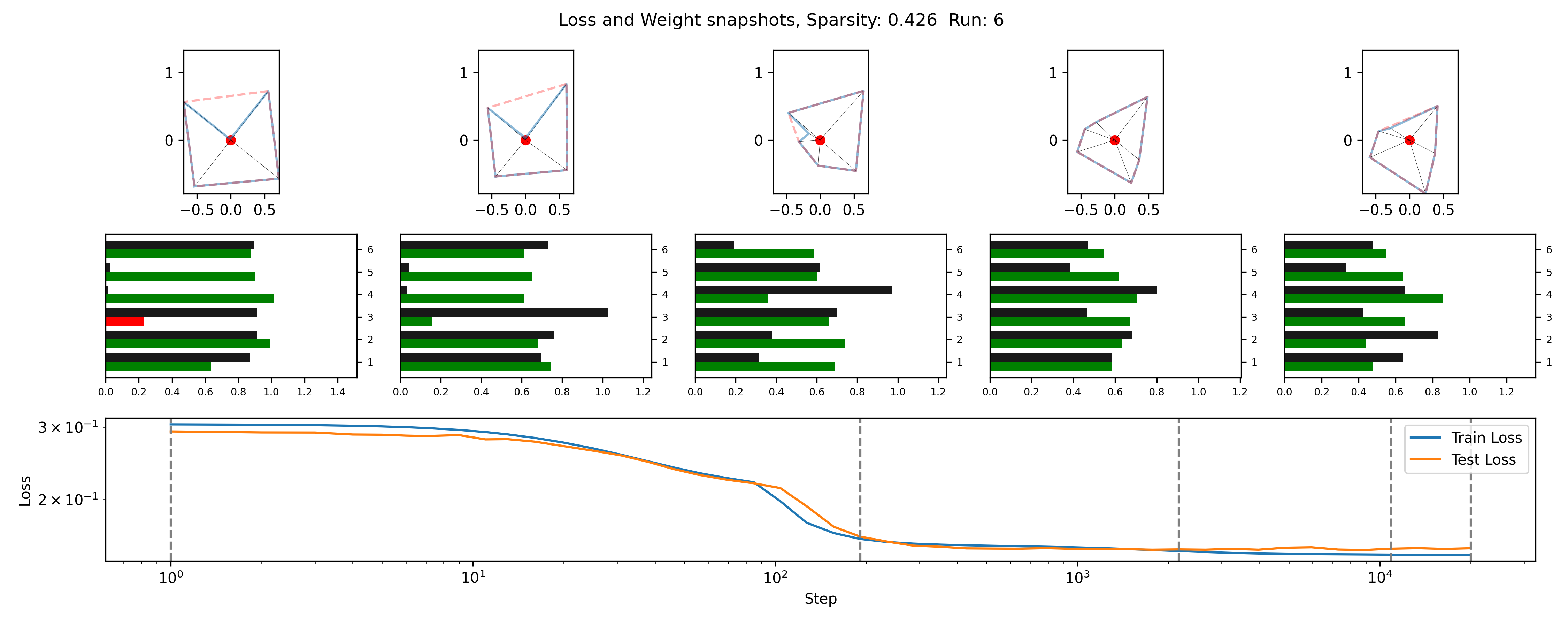 Figure 7 - Training dynamics of a sparse autoencoder with 0.426 sparsity (Run 6). The visualization shows weight evolution across five training checkpoints (steps 1, ~200, ~2000, ~10000, and final). Top row: geometric representation of encoder weights as vectors forming polygons in 2D space, with the convex hull shown as a red dashed line. Middle row: bias magnitudes for each neuron, where green bars indicate positive biases and red bars indicate negative biases, with black bars showing weight norms. Bottom: training and test loss curves on log-log scale, with vertical dashed lines marking the snapshot locations. The polygon structure evolves from a 4-gon shape to a more irregular configuration as training progresses, while both training and test losses converge to approximately the same level.