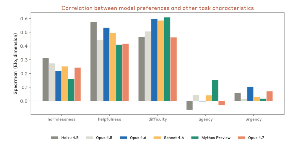 Claude Opus 4.7’s task preferences resembled Claude Opus 4.6 and Sonnet 4.6 more than Mythos Preview. Preferences correlated with helpfulness, harmlessness, and difficulty as in all prior models, but we did not see Mythos Preview’s preference for high-agency tasks. Opus 4.7’s top tasks included hard debugging, deadline-driven work, and discussions of introspection about its own experience.