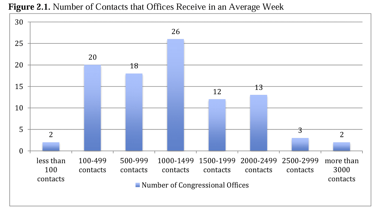 This tracks with responses from staffers elsewhere about what is required to make an office feel like an issue is important. Two responses given were “if there is a lot coming” or “enough to make a batch”, indicating the importance of a certain critical mass of communication for an office to take an idea seriously.