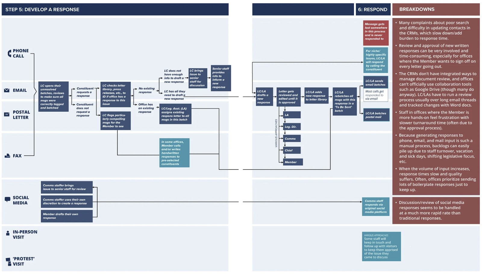 If there’s no pre-existing message, the LD and CoS will often be brought in to help generate new responses, and will almost always need to approve those new responses before they can be used. It’s worth noting that the member will sometimes be involved in the process though, one study finding 28% are involved with approving the application of pre-existing messages, 26% with reviewing and editing new responses, and 42% approving new responses.