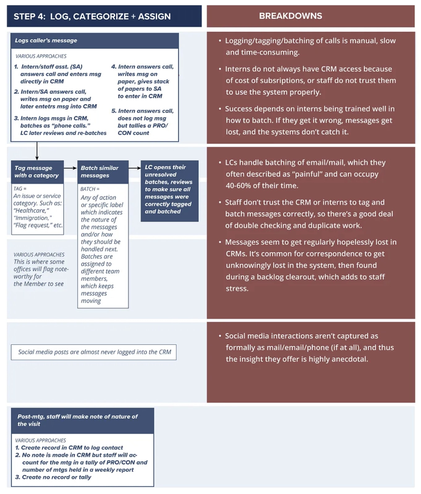 Log, categorize, and assign: Recapture the message in the office’s system, categorize them together with similar messages, and assign them to a staffer for review and follow-up.