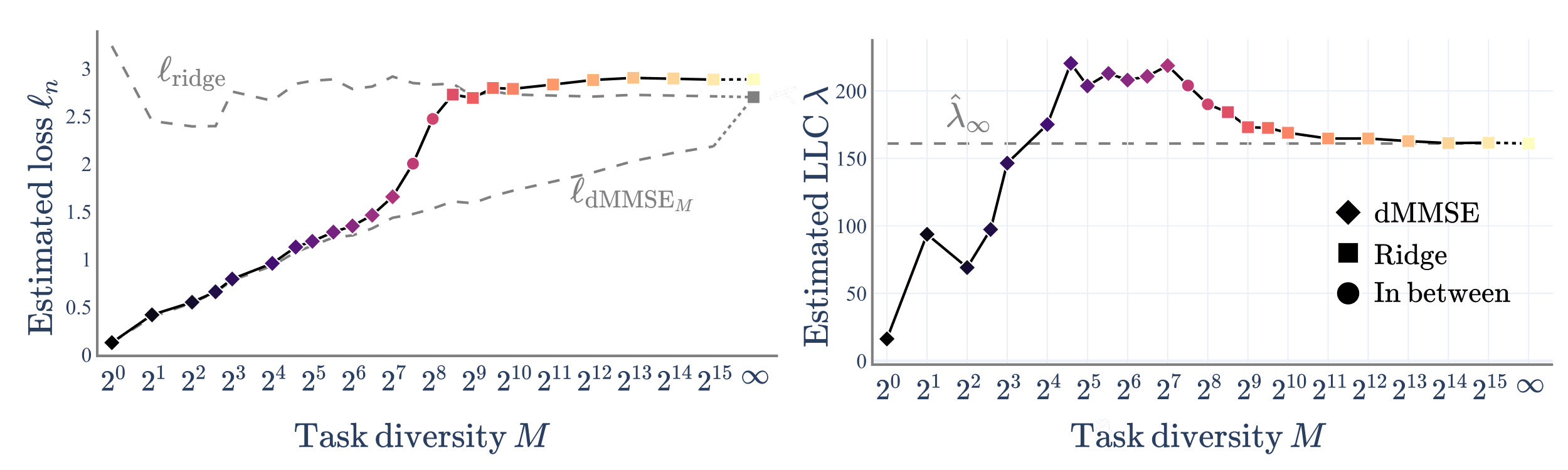 Dynamics of Transient Structure. In our latest work, we show that transformers trained for in-context linear regression initially develop a “generalizing” solution (ridge regression) before specializing to a “memorizing” solution (dMMSE) that is optimal for the training distribution. Using SLT, we explain the observed transience as a competition between performance and complexity. [Under review, Arxiv, LW & X coming soon].