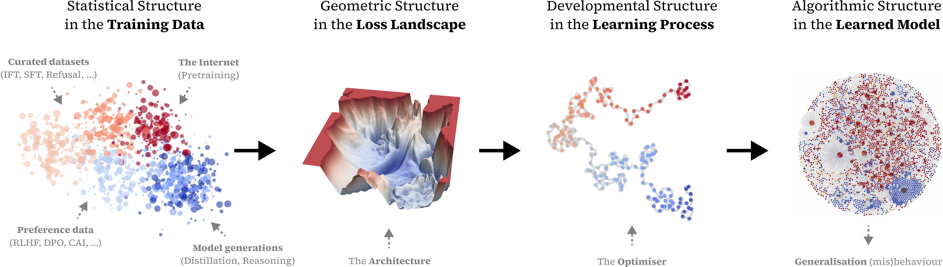 As described in our new position paper, our research agenda aims to understand how training data ultimately gives rise to model behavior by using Singular Learning Theory (SLT) to link four different kinds of structure (the “S4 correspondence”):