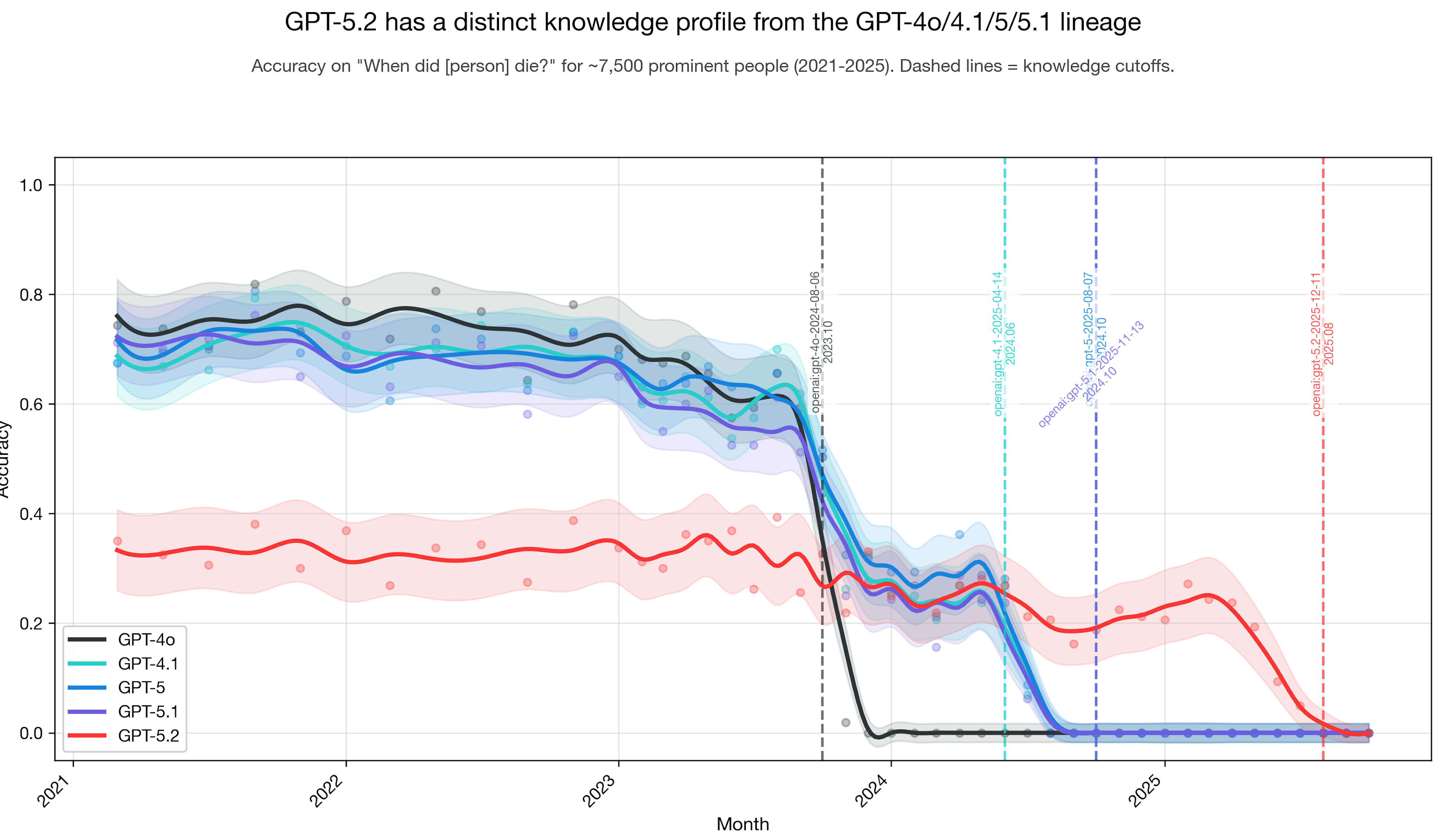 Based on the plot below, my intuition is that GPT-5 and GPT-5.1 had some pretraining data added to the original base pretraining dataset (or base model) dating back to GPT-4o; and GPT-5.2 is something different. I did this experiment a while back.