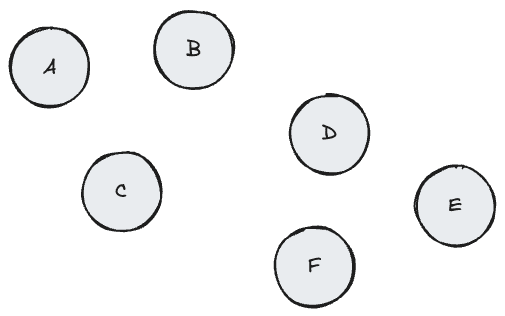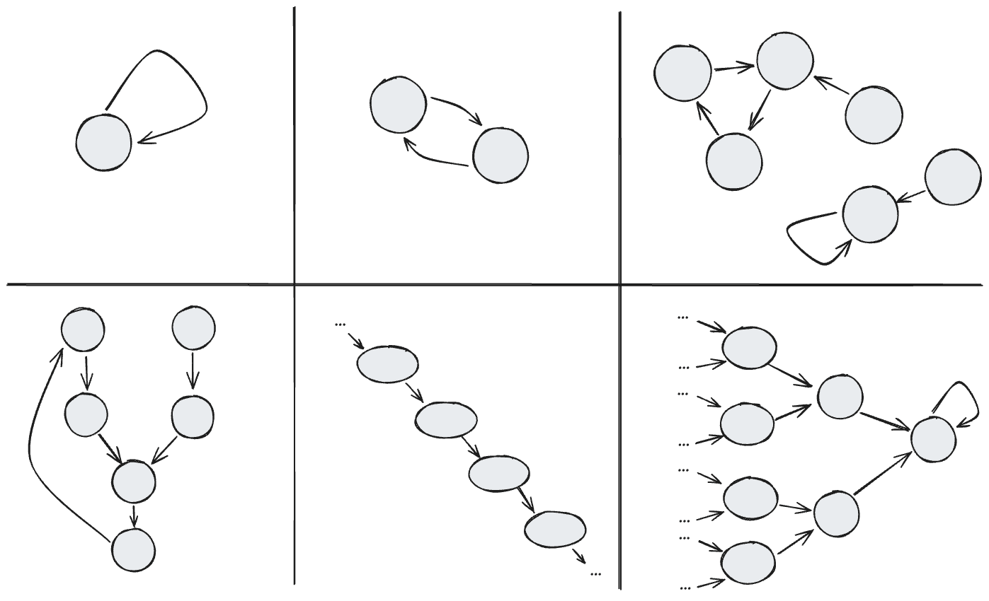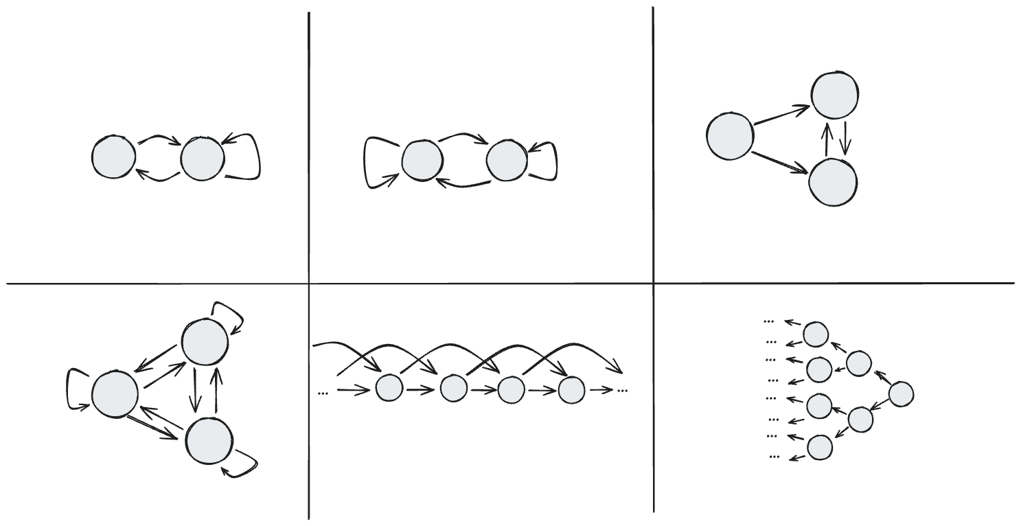 (Left to right, top to bottom: a system with one state which it’s stuck in; a system that flip-flops between its two possible states; doodling; doodling; a system with an infinite number of states, ’cause why not; and another one with infinite states, just with a more interesting structure.)