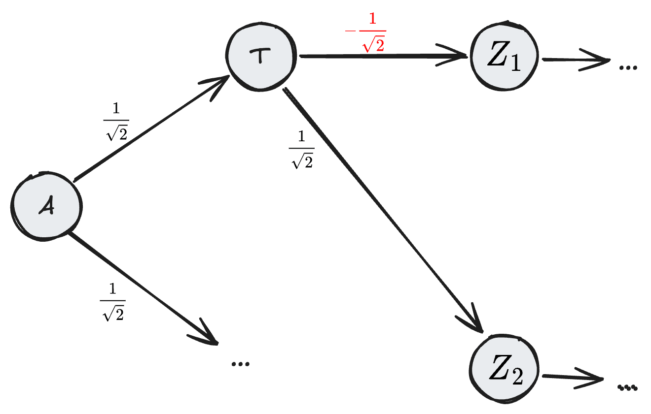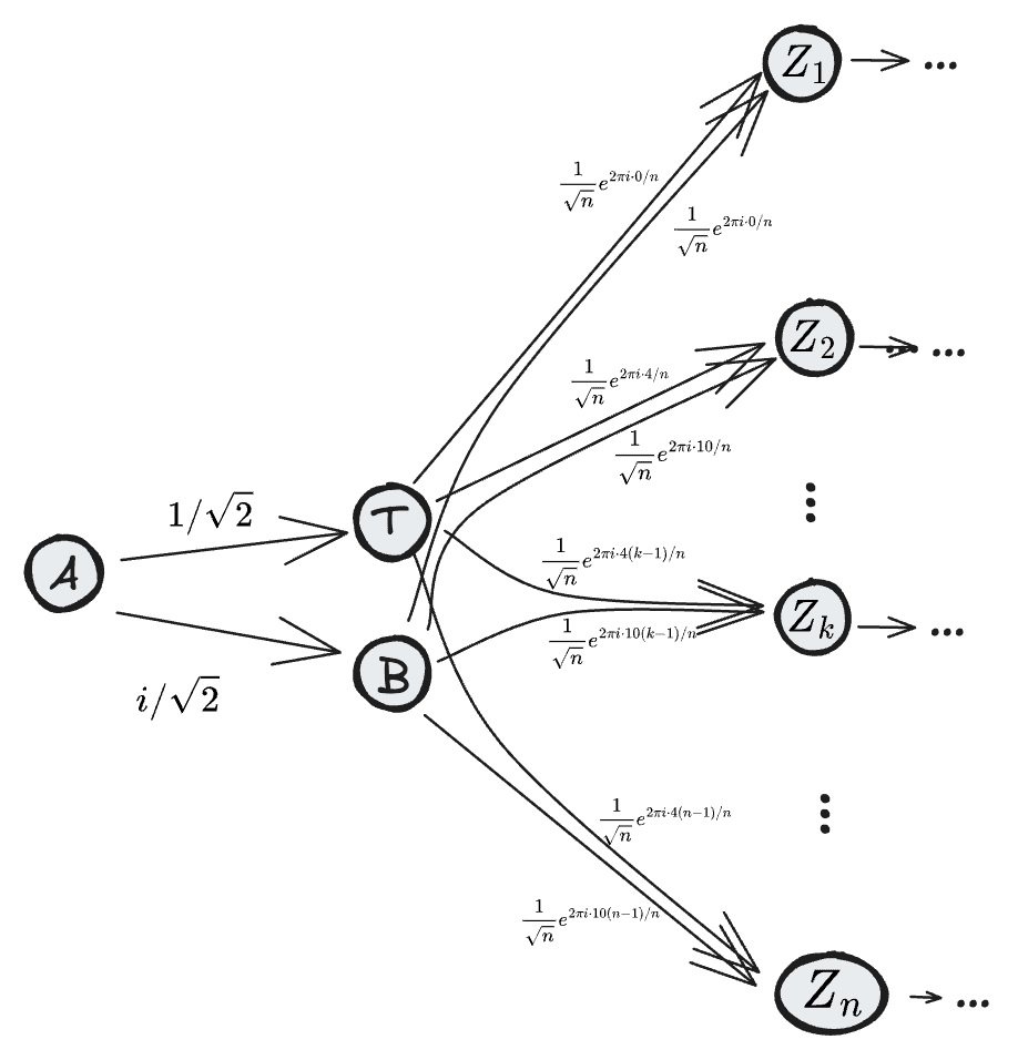 I’ve contrived for this post to only deal with real numbers; God isn’t so kind. In the real world, these diagrams would sometimes have edge-weights like , and, therefore, the basis-state-coefficients that make up a state would often be complex. For example, the last diagram above might instead have weights like...