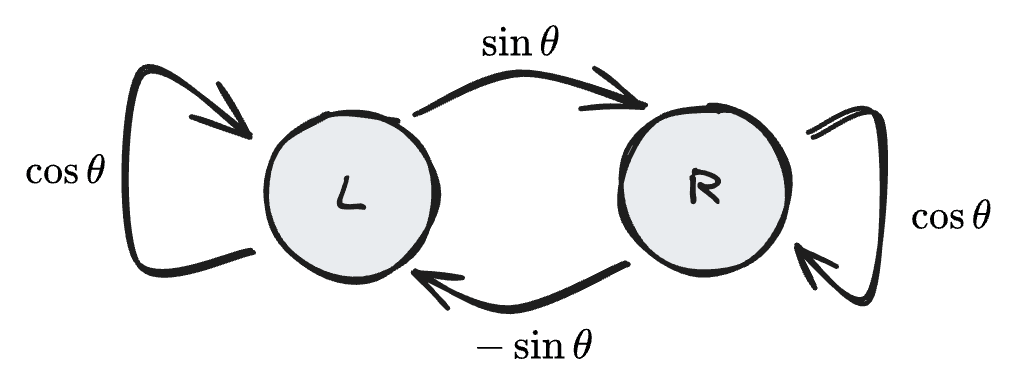 The dynamics of this system are also somewhat more complicated: rather than being a simple function , it’s now a linear function on states, which we might depict like so: