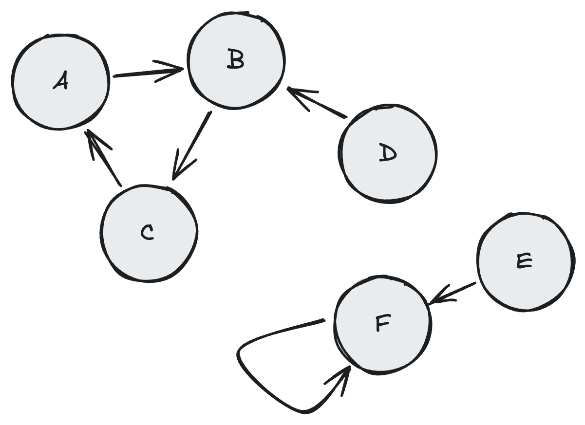 It has 6 states it can be in: through . The arrows depict the dynamics of the system: on each time-step, the system transitions to whatever state its current state’s arrow points to.
