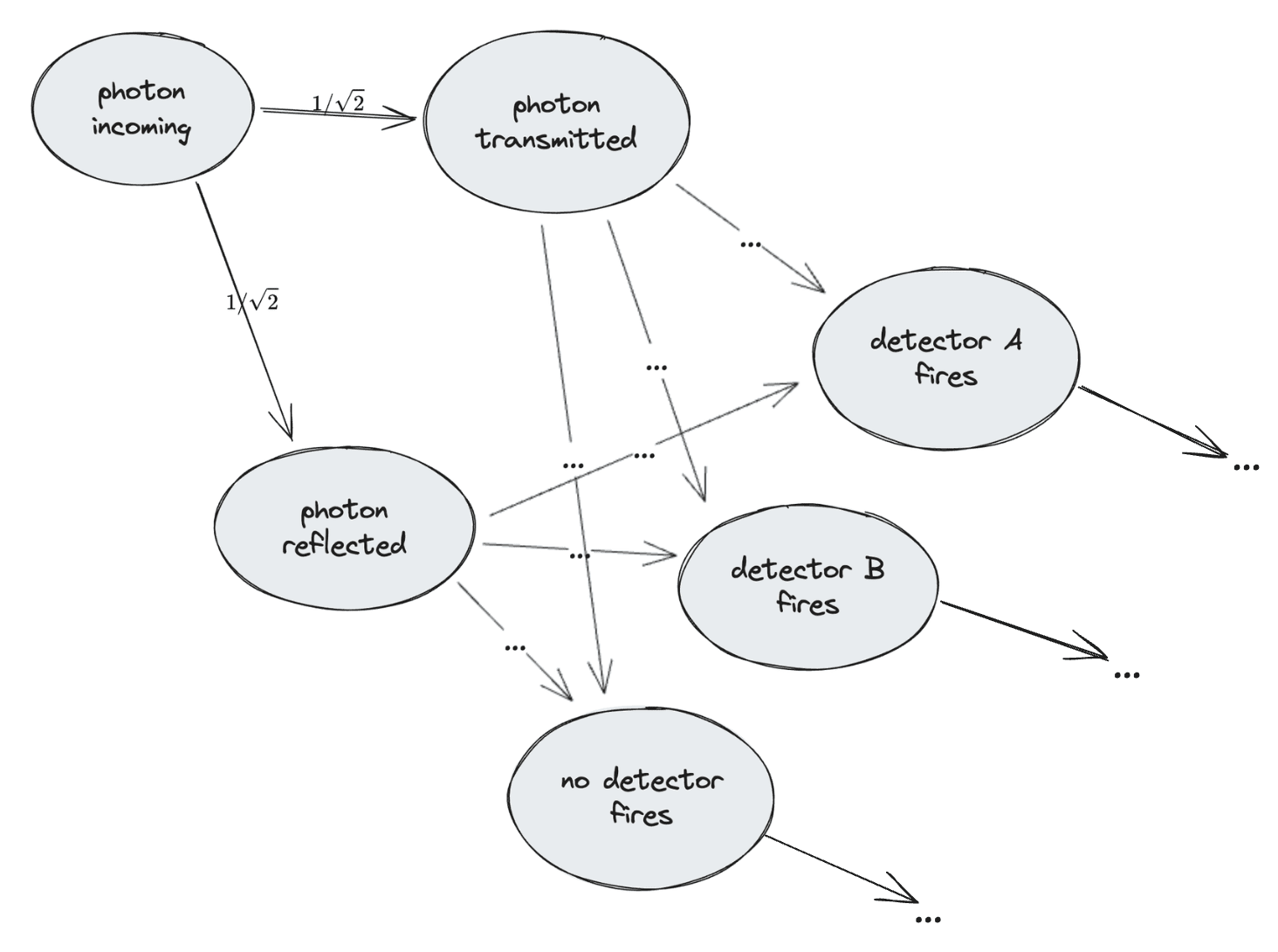 This means that, if you’re thinking about a photon interacting with a half-silvered mirror, for example, you don’t always need to get into the nitty-gritty of integrating how the wave packet evolves over time; for some purposes at least, you can just doodle a state diagram like...
