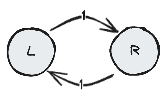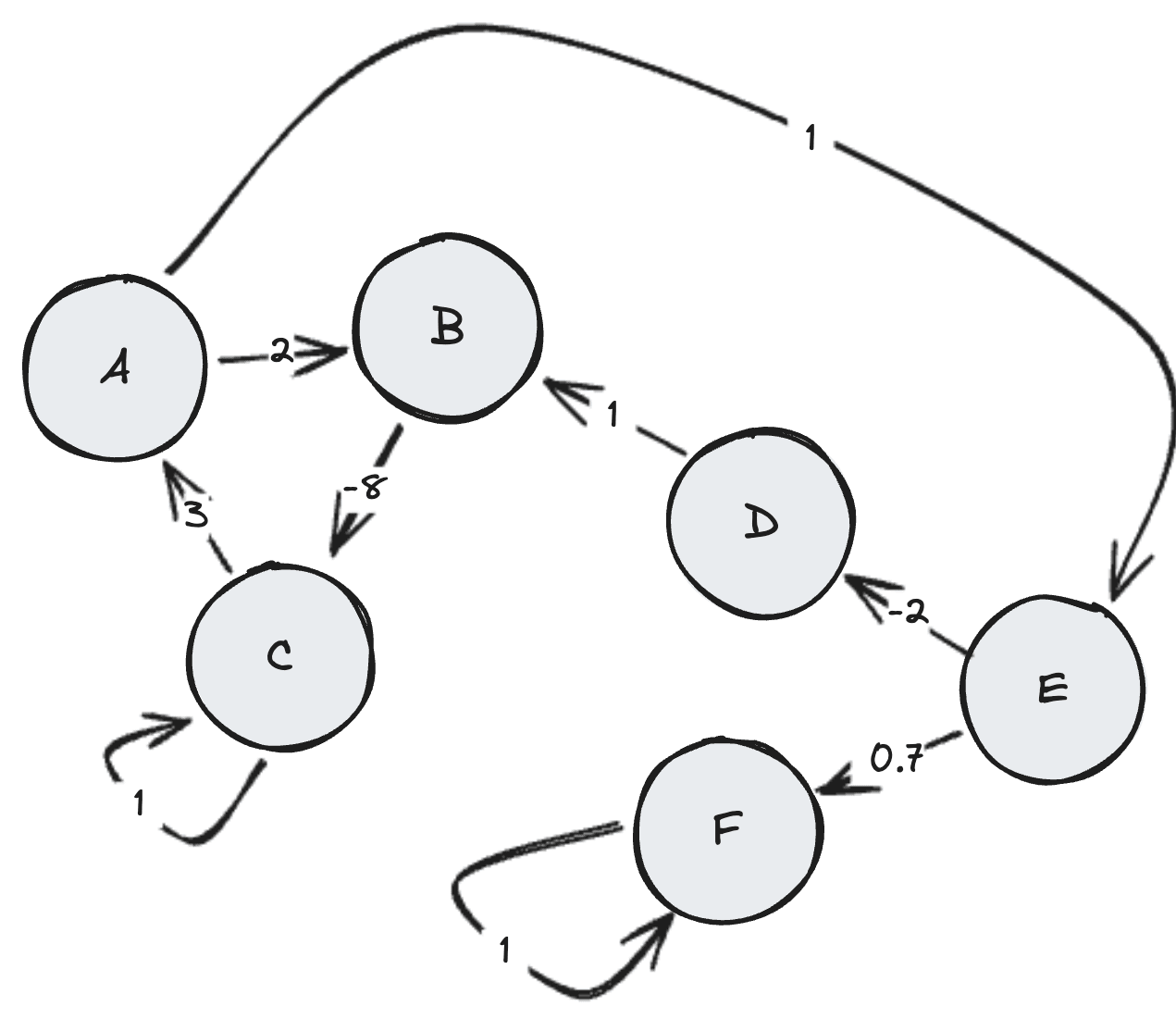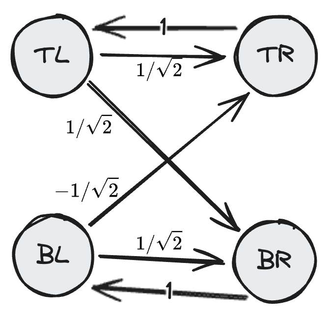 Exercise: in the last example diagram I doodled above, are the dynamics unitary? (Solution.) If so, how can you tell; else, is there a way to re-weight the edges to make them unitary? (Solution.)