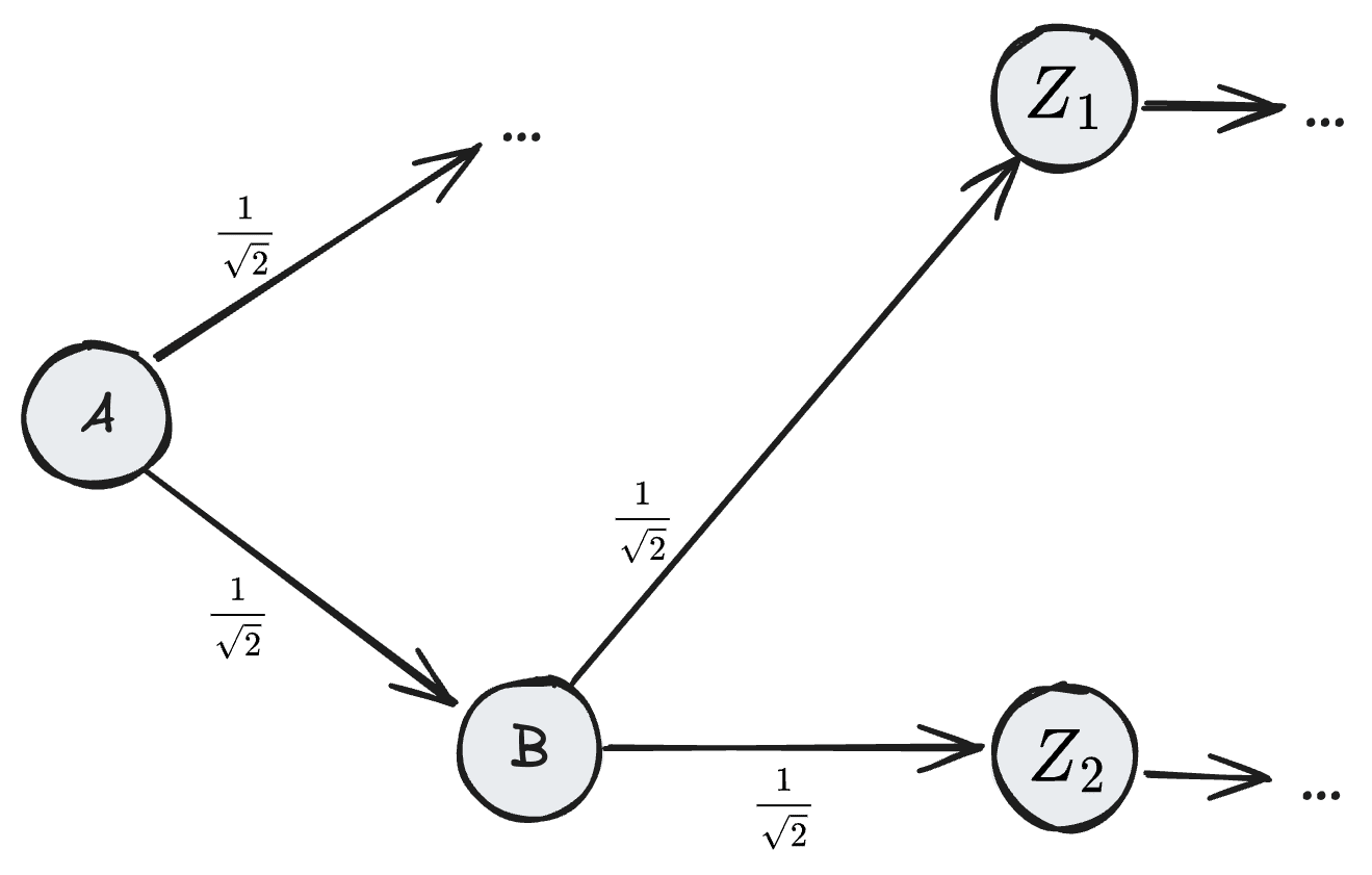 Exercise: in system (3) above, again starting in state : what can you say about the coefficients of the basis-states downstream of , for ? (Assume that and share no descendants; the universe forks off in two completely different directions at that point.) (Solution.)