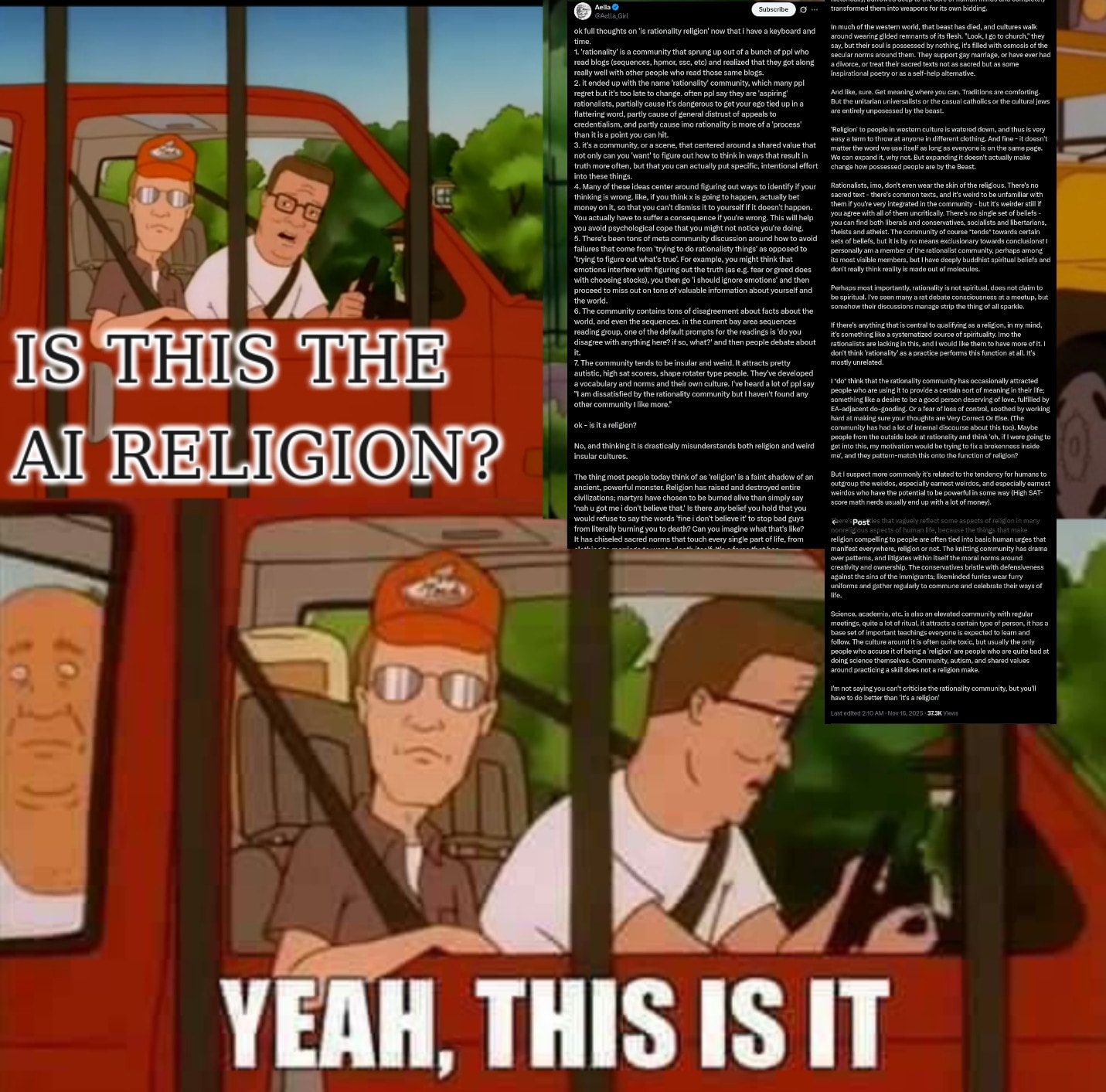 I feel reasonably certain that Judaism alone proves that “not arguing about things” is not, in fact, a defining trait of religions. Reading canonical writings about the meaning of life and the correct way to think and then having a detailed argument about it is an inherently sacred act in Judaism. What rationalism as an institution most seems to resemble is a very culturally Jewish form of transhumanism. Rationalism focuses intensely upon apocalyptic doom, and highly values a specific sort of education, scholarship, and debate as practices towards preventing it. Perhaps not coincidentally, Eliezer was raised as an Orthodox Jew. (And honestly? Thank God for that. Peter Thiel is currently preaching an esoterically Christian form of transhumanism, and it’s a fucking nightmare. May it find no disciples.)