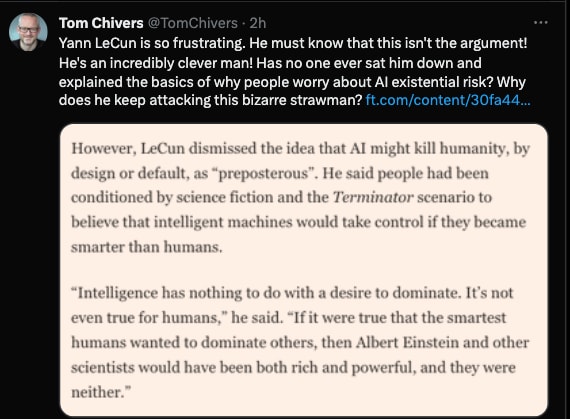 For example Youtube: Yann LeCun and Andrew Ng: Why the 6-month AI Pause is a Bad Idea shows rather clearly his straightforward worldview re AI safety, and I’d be surprised if his simple dismissal—however surprising—of everything doomsday-ish was just strategic.
