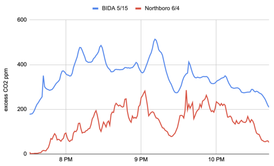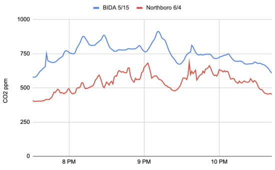 Looking at the area under the curve, a dancer at Northboro likely experienced about 40% of the risk of one at BIDA (448 vs 1,116 ppm hours of excess CO2).