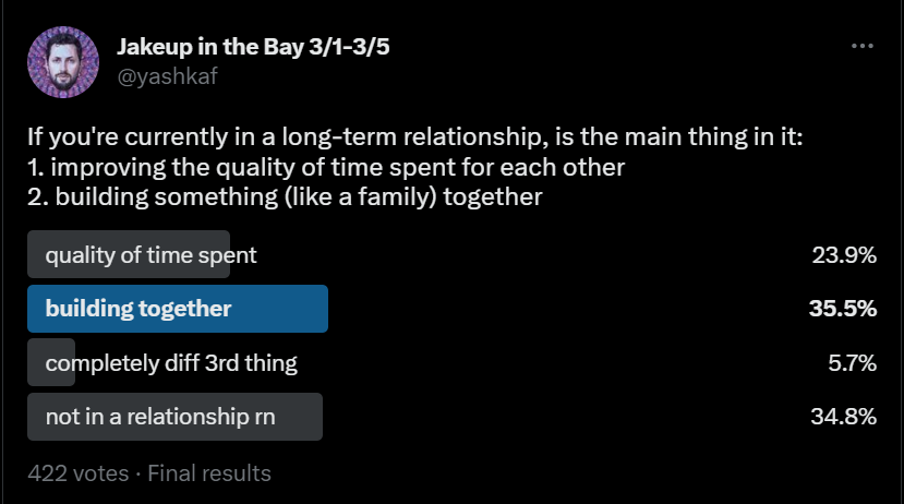Before giving more detail on those, it’s interesting that most people intuitively get it. It’s a rare Twitter poll that doesn’t have several people in the comments complaining that the given four choices don’t capture the full gamut of human experience, yet over 90% of respondents in a relationship picked one of the two choices.