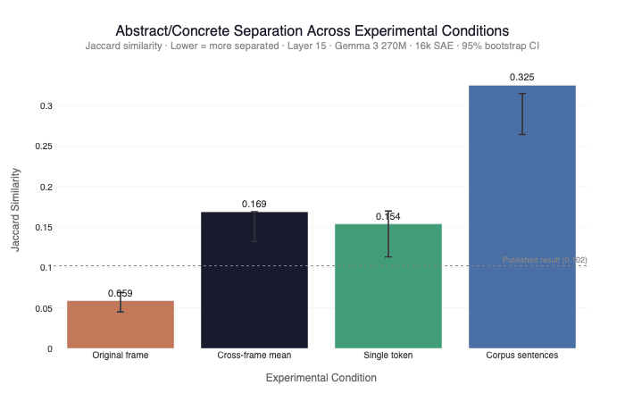 The strongest result of the entire robustness battery: 100% of the frame-robust features from Experiment 1 were also active in the Wikipedia sentences. All 18 abstract-robust and all 57 concrete-robust features persisted. So these features seem to not just be artifacts of my prompt templates, they fire in real text too. The higher Jaccard in the corpus condition reflects additional features activated by diverse contexts, not the absence of the axis signal.
