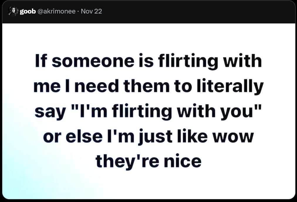 If you’re literally not trying at all, that’s definitely not going to work. Alas, from what I can tell Alexander is correct here, in that even the very spaces where the You Had One Job was ‘actually approach women’ are increasingly coming out firmly against the one thing that ever works, and moving from an agentic narrative where you can make it work to an anti-agentic one where you shouldn’t try.