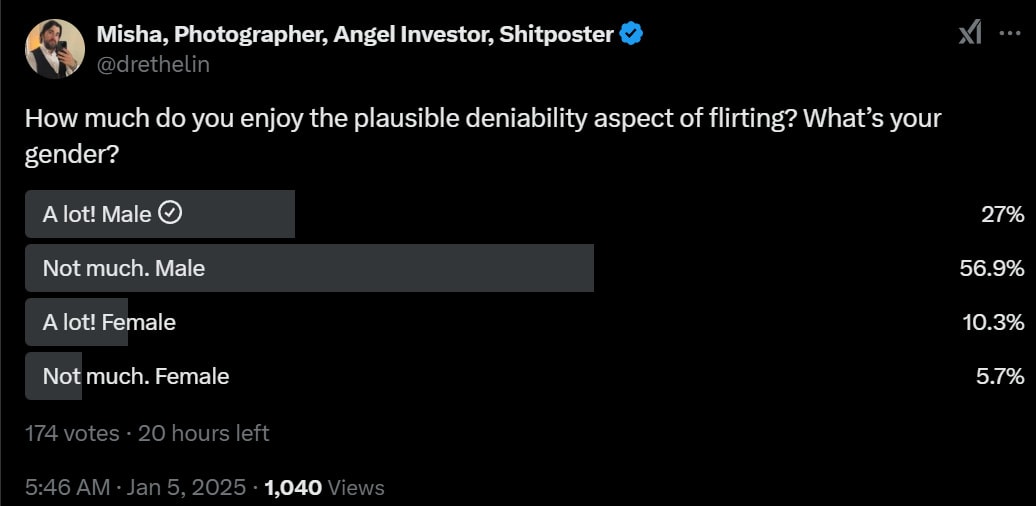 Poll of my friend Ben Daly’s Instagram following, which is virtually all single 18-34 yr old women in the U.S. and U.K.