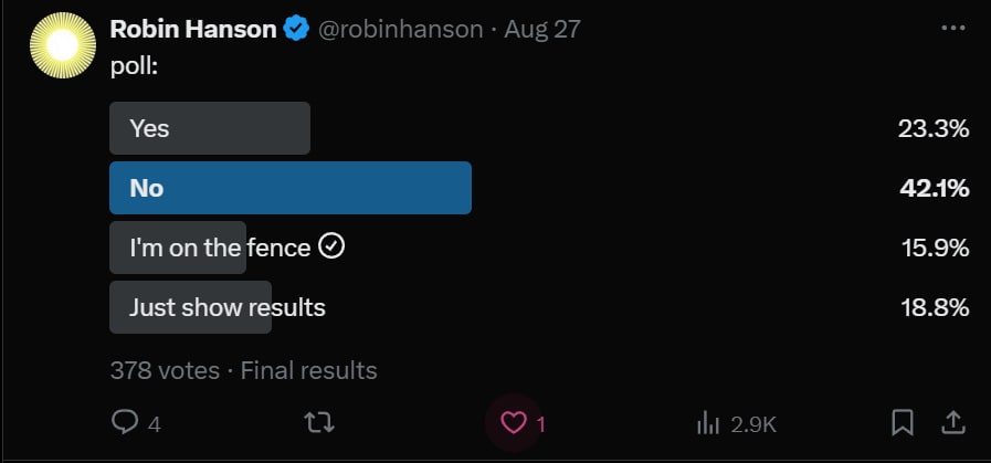 Emmett Shear: Percentage reporting yes on experiencing “god mode”, according to my poll.