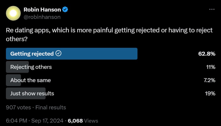 Robin Hanson: I’m unusually averse to rejection. Some see that as irrational; I should get over. I guess as they don’t think it makes sense to have preferences directly over such a complex thing; prefs should be on simpler outcomes. But how do I tell which outcomes are okay to matter?