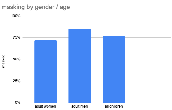 Looking by gender/age, women were less likely to be masked (72%, 56/78) than men (85%, 74⁄87). [1] Children were in between (77%, 10/13), though I didn’t count children in bicycle trailers or strollers: