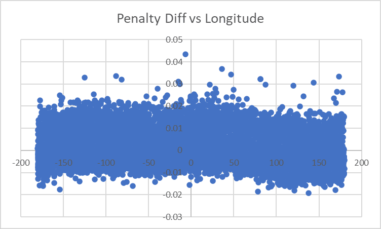 Here it looks like our cosine function isn’t quite right. We’re treating longitudes around 0 through −50 as worse than we should, and those around 100 wrapping around to −150 as better than we should. Let’s try shifting the cosine fn a little next run and using 50 instead of 60 as our center?