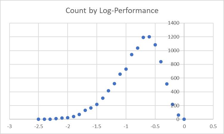 But we’ve seen a few things since then. In particular, looking at how different effects interacted makes them look multiplicative rather than additive. So now let’s try instead getting a frequency chart of Log(Performance):