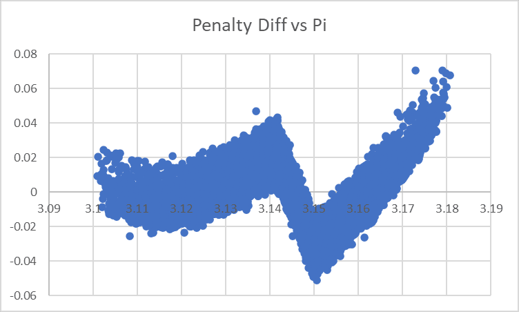 Now that is interesting. It seems that the Pi effect is more complicated than we realized: while we wrote our logic assuming a transition at the true value of pi, we see another transition at 3.15 exactly. For the next run, as well as using ‘amount greater than 3.14159’ for the ‘too-high’ penalty, let’s use ‘amount greater than 3.15’ for a separate penalty field and see how that goes.