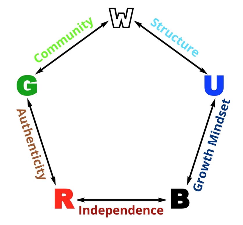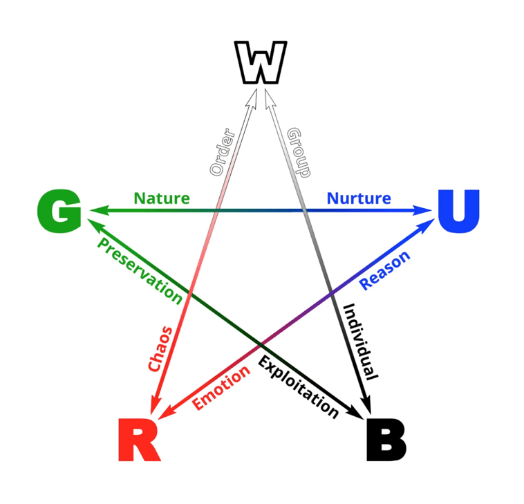 But one system I’ve run into has stuck with me, and become a reference point: namely, the Magic the Gathering Color Wheel. (My relationship to this is mostly via somewhat-reinterpreting Duncan Sabien’s presentation here, who credits Mark Rosewater for a lot of his understanding. I don’t play Magic myself, and what I say here won’t necessarily resonate with the way people-who-play-magic think about these colors.)
