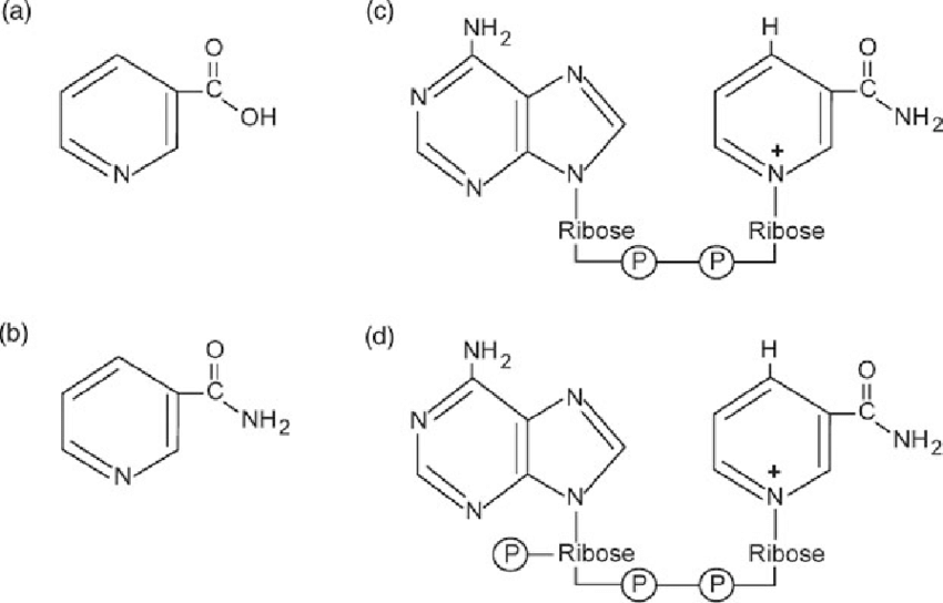Chemical structures of niacin compounds: (a) nicotinamide; (b) nicotinic acid; (c) nicotinamide adenine dinucleotide (NAD þ ); (d) nicotinamide adenine dinucleotide phosphate (NADP þ ) (source)