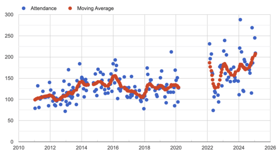 Attendance grew to a peak at the beginning of 2016, fell to a trough at the beginning of 2018 (prompting me to write a worried blog post), recovered in 2018 and stayed ~level until the pandemic hit, and then has really taken off since resuming.